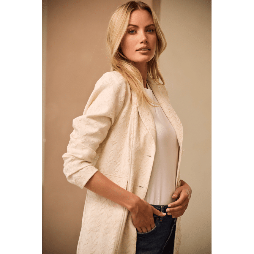 Helena Hart jas van een luxe, licht gestructureerde stof met een verfijnd dessin. Deze jas heeft een tijdloze uitstraling en voelt tegelijkertijd modern door de cleane belijning en elegante afwerking. Een perfecte tussenjas die moeiteloos past bij zowel een geklede als een meer casual look.