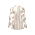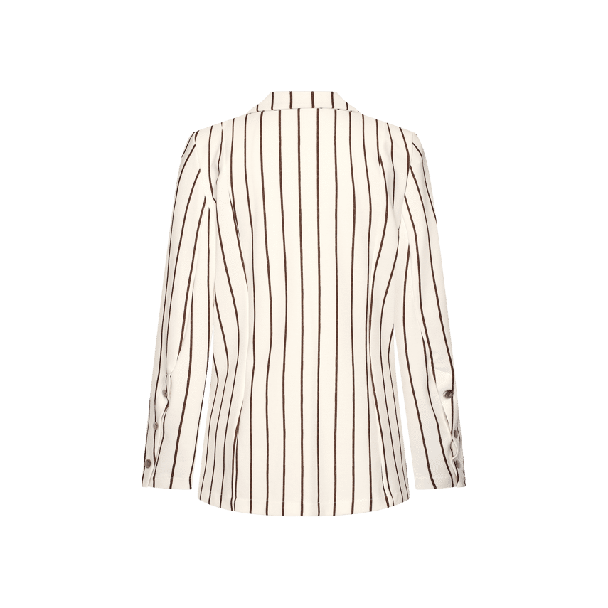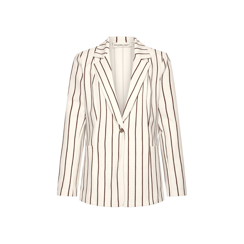 Blazer van het merk Helena Hart. Deze stijlvolle blazer heeft een tijdloze uitstraling met een moderne twist dankzij het verticale streepdessin in een subtiele contrastkleur. Het model is voorzien van een klassieke reverskraag en een knoopsluiting met één knoop, wat zorgt voor een elegante en vrouwelijke pasvorm. De licht getailleerde snit benadrukt het silhouet, terwijl de soepele stof zorgt voor een comfortabel draaggevoel. De paspelzakken aan de voorzijde geven de blazer een nette en verzorgde afwerking.