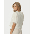 Blouse van merk Neo Noir. Deze bijzondere blouse valt op door de speelse, zachte structuur in de stof die zorgt voor een elegante en modieuze uitstraling. Het korte model en de wijde mouwen geven het ontwerp een luchtige en moderne look, terwijl de sierlijke knoopsluiting aan de voorkant het geheel een verfijnde touch geeft.