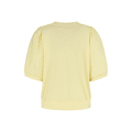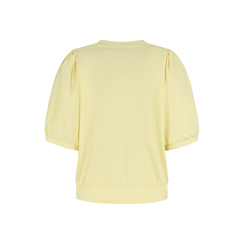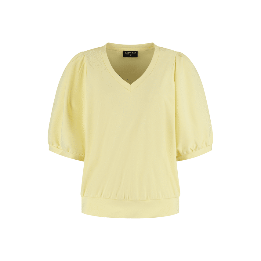 Top van Lady Day in een zachte lichtgele tint die direct een frisse en vrouwelijke uitstraling geeft. De soepelvallende stof en de subtiele plooitjes bij de schouders zorgen voor een elegante look, terwijl de elastische boord aan de onderzijde een mooi bloezend effect creƫert.