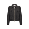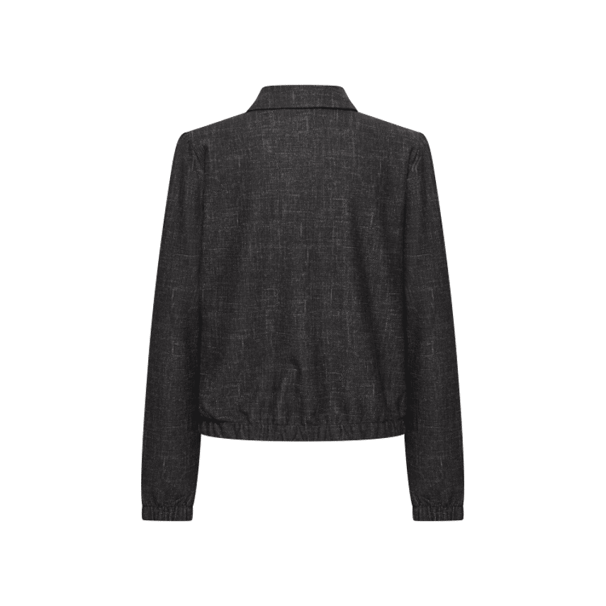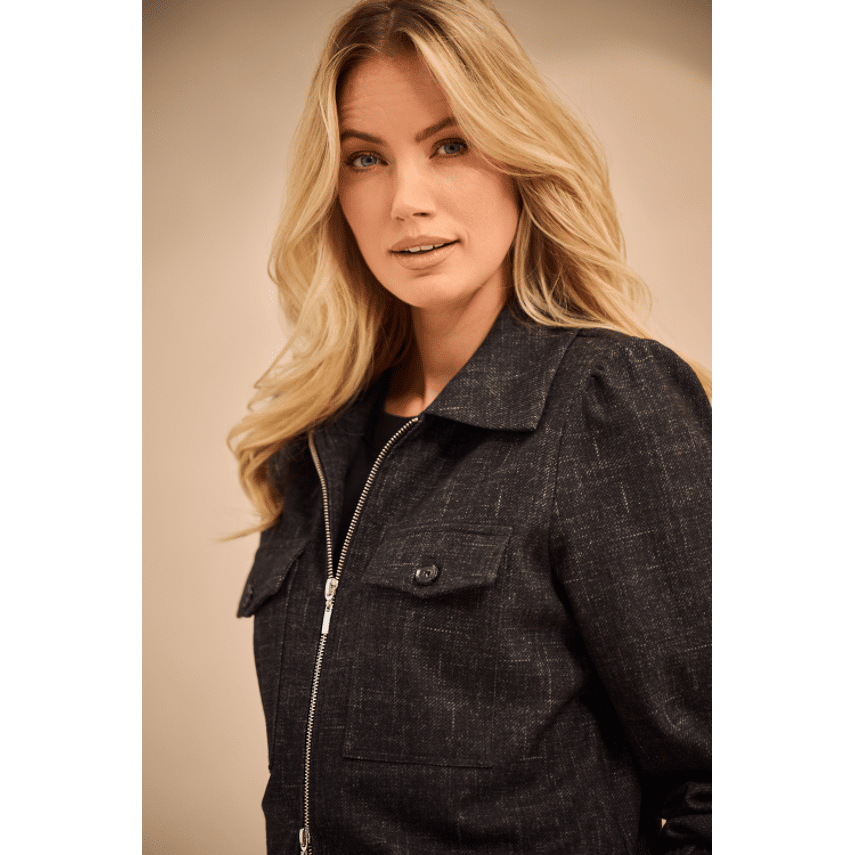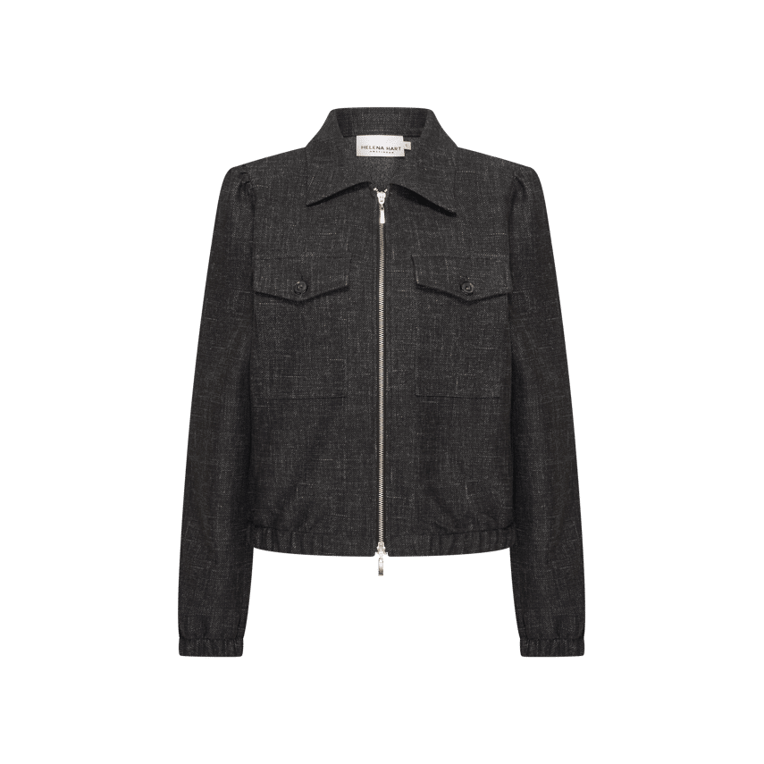 Jack van Helena Hart. Dit korte jack heeft een moderne, tijdloze uitstraling met een sportieve twist. De subtiele gemêleerde structuur in het donkere grijs geeft het jasje een stijlvolle look, terwijl de zilverkleurige ritssluiting en borstzakken met klep zorgen voor een stoer accent. De elastische boord aan de onderkant creëert een mooi silhouet en een comfortabele pasvorm.