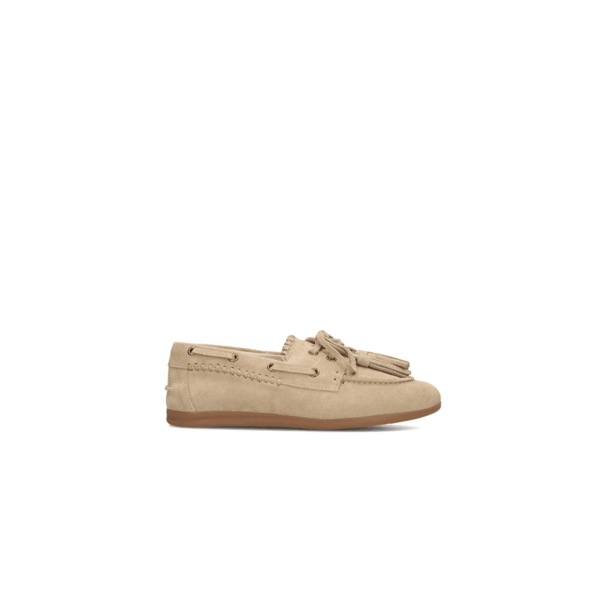 Loafer van PS Poelman in een zachte beige tint, uitgevoerd in soepel suède met een casual-chique uitstraling. Deze loafer ademt zomerse nonchalance en is ideaal voor dagen waarop comfort en stijl samenkomen. De verfijnde veterdetails en speelse franjes geven de schoen een eigentijdse twist, terwijl de lichte zool zorgt voor een prettige loopervaring.
