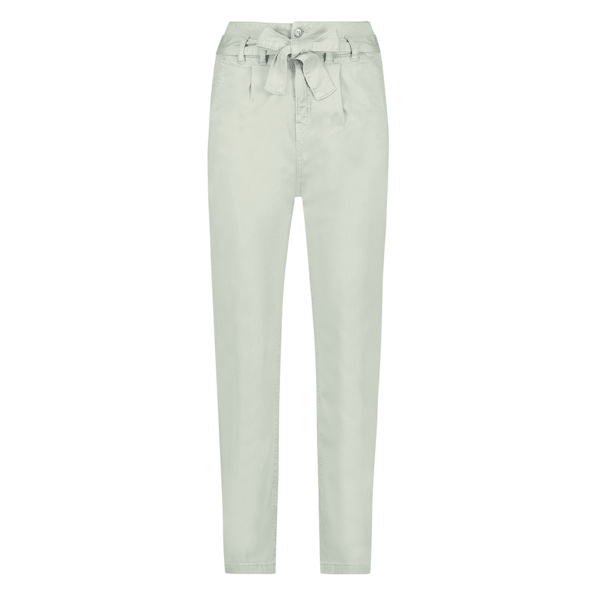 Hoge paperbag broek met strikceintuur en bandplooi. In een prachtige salie groene kleur. De broek heeft lekkere stretch en valt hoog.
