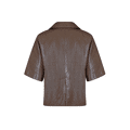 Jasje van Poools. Dit korte jasje in een warme bruintint heeft een super trendy, glossy look die meteen opvalt. De korte mouwen en de blazerachtige kraag geven het een stoere, fashionable uitstraling. Perfect als tussenjasje of als statement piece over een basic top.