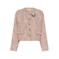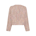 Jasje van Culture. Dit stijlvolle jasje heeft een luxe, vrouwelijke uitstraling dankzij de rijke tweedstructuur met een subtiele mix van zachte pasteltinten. De ronde hals en decoratieve knopen geven het ontwerp een elegant karakter, terwijl de bloemapplicatie zorgt voor een speels, verfijnd accent. De rechte, iets kortere pasvorm maakt dit jasje perfect om zowel chic als casual te dragen.