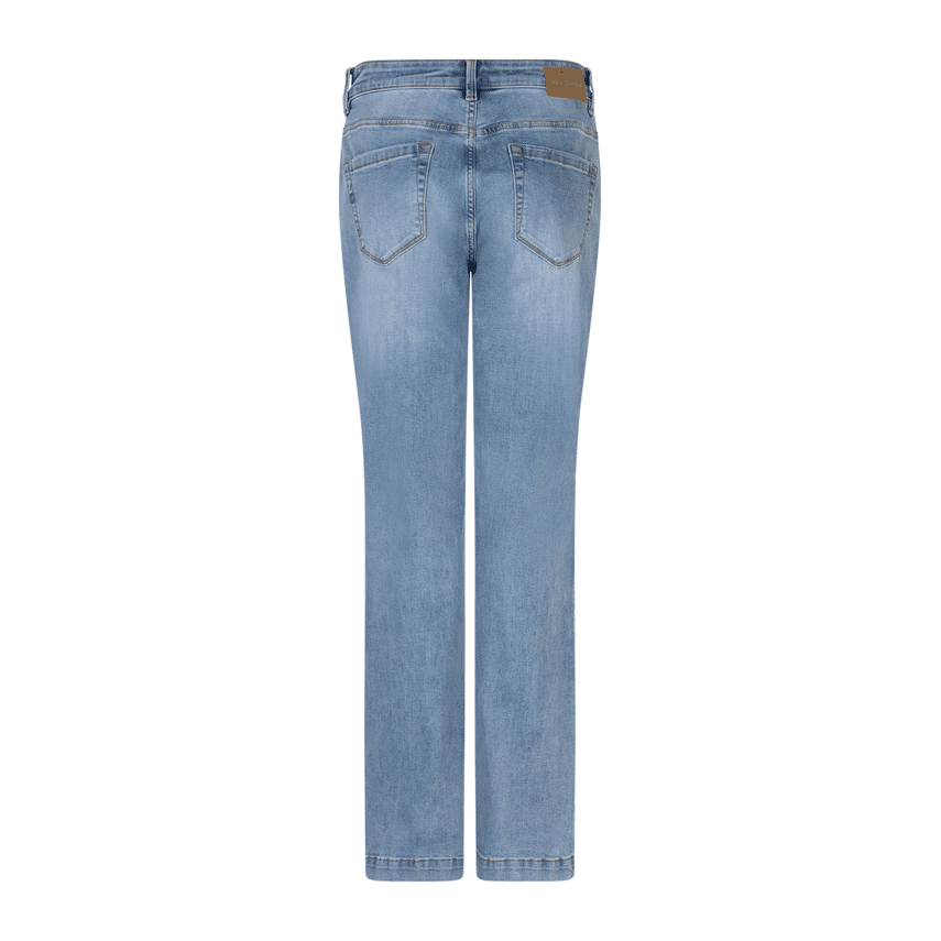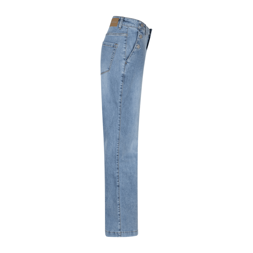 Jeans van Red Button. Deze denim is een echte klassieker met een speelse twist. De mooie middenblauwe wassing geeft de jeans een frisse, tijdloze uitstraling en de subtiele sierknopen aan de voorkant zorgen voor net dat beetje extra. Door de rechte pijp en comfortabele fit is dit een broek die je makkelijk elke dag draagt, van casual tot gekleed.