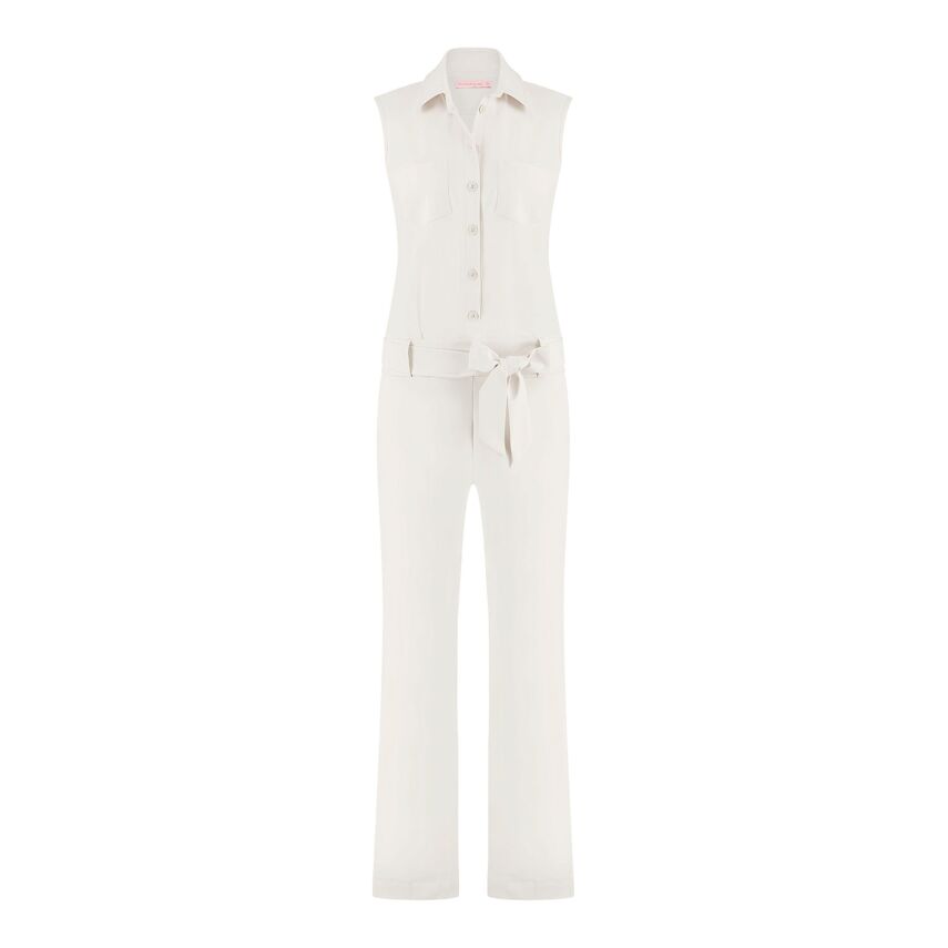 Mouowloze travel jumpsuit van het merk Studio Anneloes. Deze jumpsuit heeft een lange straight leg pijp, knoopsluiting, kraagje en ceintuur van hetzelfde materiaal.