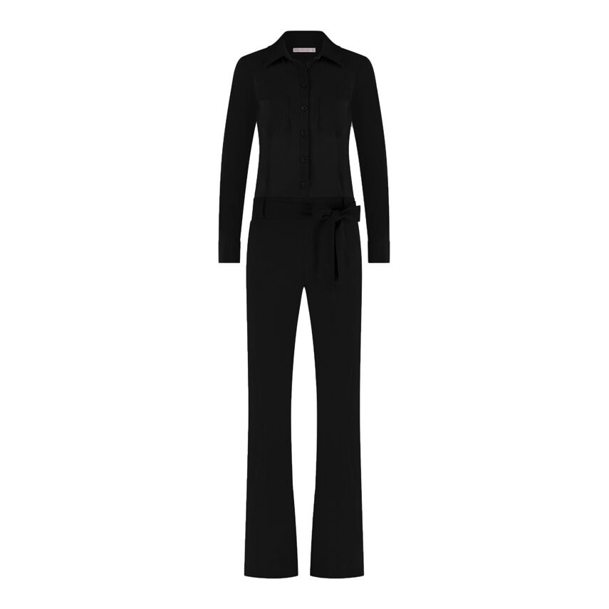 Travel jumpsuit van het merk Studio Anneloes. Deze jumpsuit heeft een lange rechte pijp, lange mouwen, knoopsluiting en kraagje.