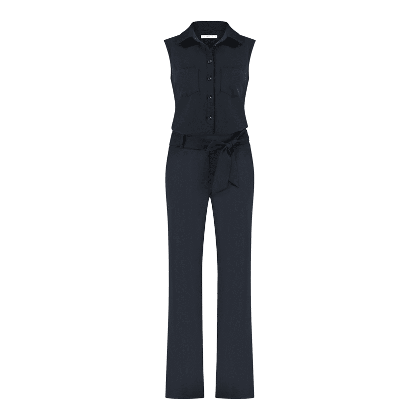 Mouwloze jumpsuit van het merk Studio Anneloes. Deze jumpsuit heeft een kraagje, knoopsluiting, ceintuur en een straight leg.