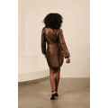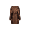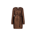 Jurk van Lofty Manner. Deze stijlvolle jurk in rijke bruintinten brengt direct een vleugje luxe en verfijning aan je look. De glanzende lederlook stof geeft het item een moderne, vrouwelijke uitstraling, terwijl de soepele pasvorm en het strikceintuur je silhouet op een elegante manier accentueren. Een echte eyecatcher die comfort en klasse moeiteloos combineert.