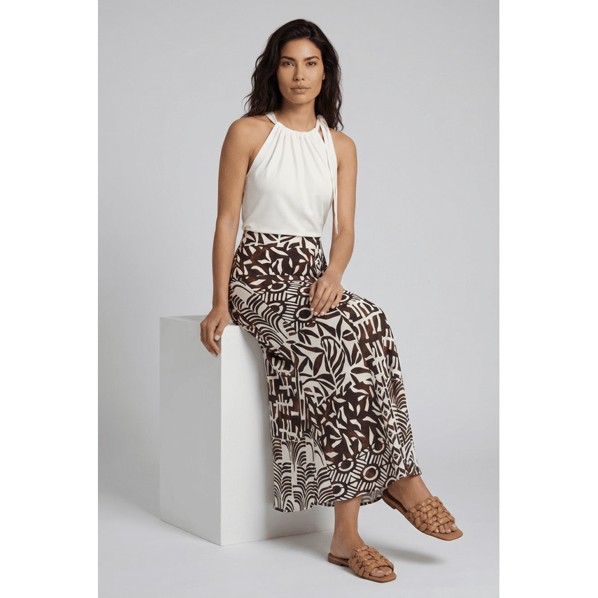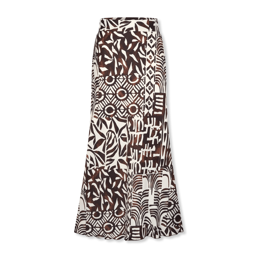 Lange rok van het merk Helena Hart met een opvallende grafische print in warme bruintinten en off-white. De combinatie van verschillende patronen geeft de rok een speelse en eigentijdse uitstraling. De rok heeft een soepelvallende pasvorm en loopt licht uit, wat zorgt voor een vrouwelijk silhouet en een mooie beweging bij elke stap. De gladde tailleband zorgt voor een comfortabele fit en een nette afwerking. Een echte blikvanger die zowel casual als chic te stylen is en perfect past binnen een zomerse garderobe.