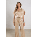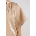 Blouse van het merk Nukus in een elegante champagnekleur met subtiele glans. De soepelvallende stof en de wijde korte mouwen geven deze blouse een luchtige en vrouwelijke uitstraling. De kleine opstaande hals met V-opening en fijne plooien bij de halslijn zorgen voor een verfijnd en stijlvol detail.