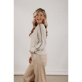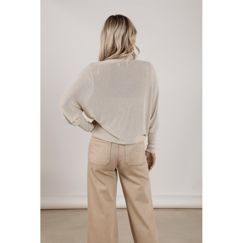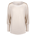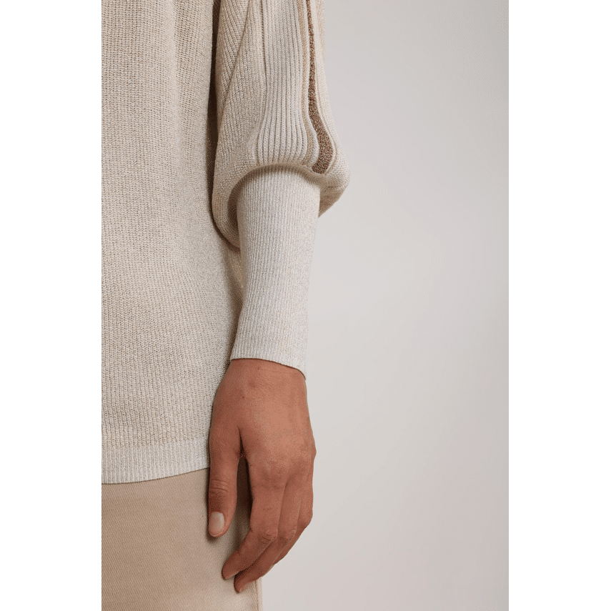 Trui van Nukus. Deze fijne, lichtgebreide trui straalt pure luxe uit dankzij de subtiele lurex glans en de zachte zandkleur. Het model heeft een comfortabele, iets ruimere pasvorm met een elegante boothals en mooie ribdetails langs de schouders en mouwen. Perfect voor een stijlvolle everyday look, waarbij comfort en uitstraling moeiteloos samenkomen.