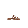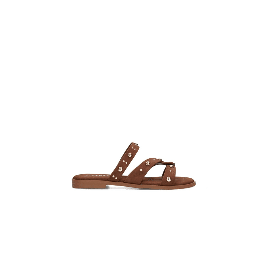 Slippers van Posh in een warme bruine tint met een stoere en zomerse uitstraling. Het model heeft meerdere bandjes over de voet en is afgewerkt met goudkleurige studs die zorgen voor een speels en stijlvol detail. Het platte model en het zachte voetbed maken deze slippers comfortabel en ideaal voor warme dagen.
