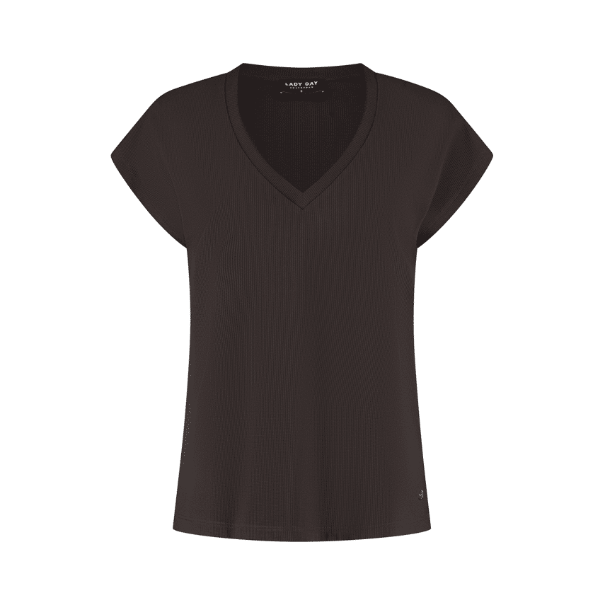 Top van Lady Day in een warme donkerbruine kleur met een subtiele structuur voor een stijlvolle en moderne uitstraling. De V-hals en korte mouwen zorgen voor een vrouwelijke en luchtige look, terwijl de soepele stof comfortabel draagt. Een veelzijdige basic die perfect te combineren is.