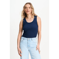 Top van het merk Pom Amsterdam in een diepe donkerblauwe kleur. De ribgebreide structuur en minimalistische uitstraling maken dit item tot een veelzijdige essential voor elke garderobe. De top heeft een aangesloten pasvorm en is uitgevoerd met een ronde hals en brede schouderbanden. De stretchy ribstof zorgt voor een comfortabele fit die mooi aansluit op het lichaam. Het subtiele logo onderaan geeft een speels en herkenbaar detail.