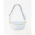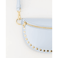 Deze compacte crossbody tas heeft een moderne, halfronde vorm en is uitgevoerd in soepel leer. De goudkleurige studs langs de onderzijde geven de tas een stoere maar vrouwelijke uitstraling, terwijl de goudkleurige rits zorgt voor een luxe touch. Dankzij het afneembare en verstelbare hengsel draag je de tas zowel crossbody als kort over de schouder. Verkrijgbaar in een zachte crème- en lichtblauwe tint.
