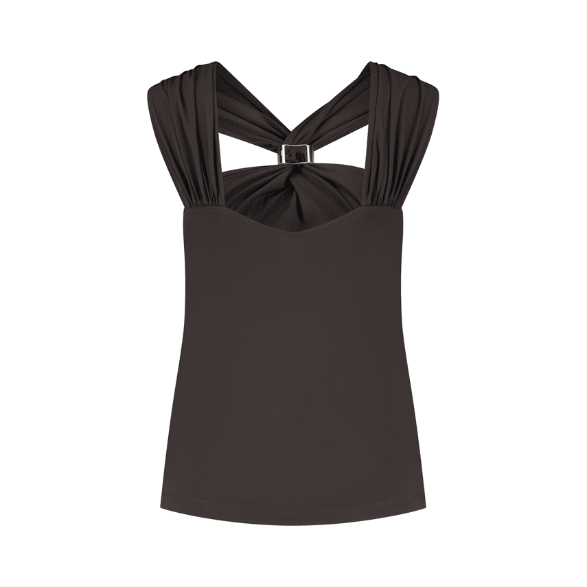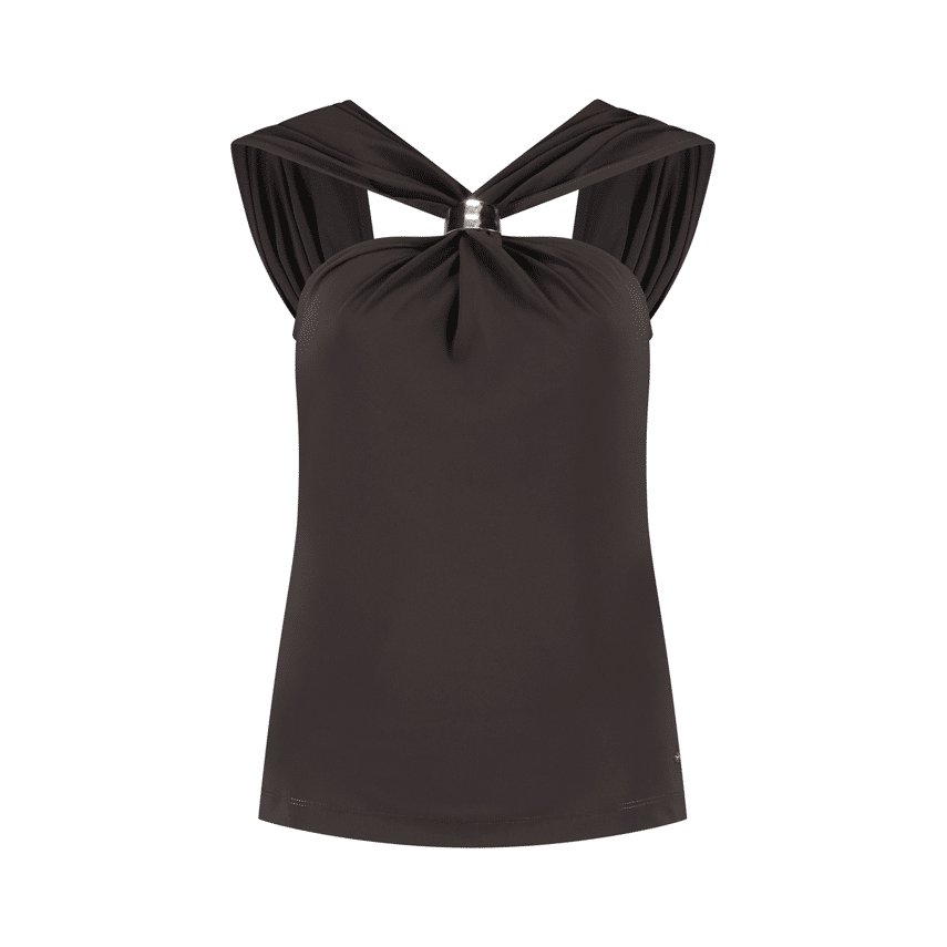 Top van Lady Day met een elegante en vrouwelijke uitstraling dankzij de bijzondere halslijn met sierlijke plooien en een goudkleurig detail. De brede schouderbanden en soepelvallende stof zorgen voor een comfortabele fit, terwijl het ontwerp een luxe en verfijnde touch geeft aan je look.