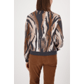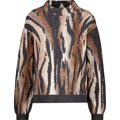 Ga voor een echte statement look met deze Monari trui in een opvallende animalprint. De warme tinten camel, bruin en offwhite worden gecombineerd met donkergrijs voor een krachtig contrast. De subtiele sprankeling van kleine strassdetails geeft de trui een vleugje glamour. Het model heeft een rechte pasvorm, een opstaande ronde hals en lange ballonmouwen met boord.