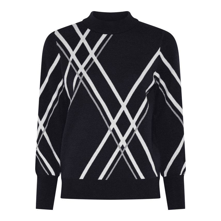 Trui van Micha. Deze donkerblauwe trui met wit grafisch ruitpatroon is een stijlvolle toevoeging aan je garderobe. De hoge ronde hals en rechte pasvorm zorgen voor een tijdloze uitstraling, terwijl het zachte breisel comfortabel aanvoelt op de huid. Een perfecte mix van klassiek en modern!