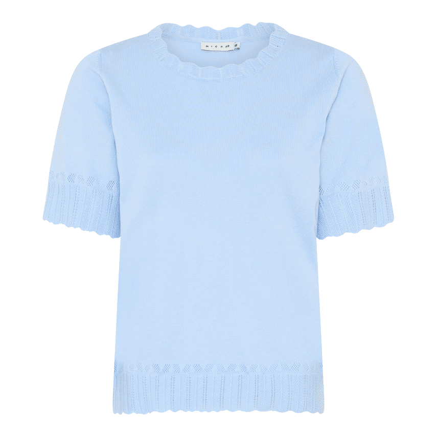 Fijngebreide trui met korte mouw, ronde hals en ajour afwerking.
