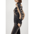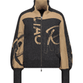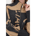 Trendy vest van Monari met opvallend grafisch design in donkergrijs en beige. Het vest heeft een recht model met een hoge kraag en ritssluiting. De jacquard ingeweven letters en subtiele glinstersteentjes geven dit item een luxe en moderne uitstraling. De ballonmouwen met brede boorden zorgen voor een speels en vrouwelijk effect.